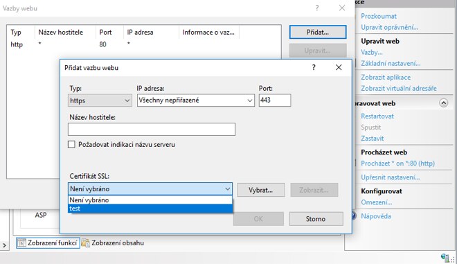 Přidejte vazbu typu https a vyberte importovaný certifikát.