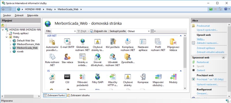 V nastavení IIS vyberte web Merbon SCADA a vpravo ve vlastnostech zvolte Upravit web, Vazby…