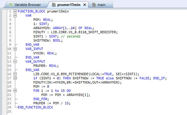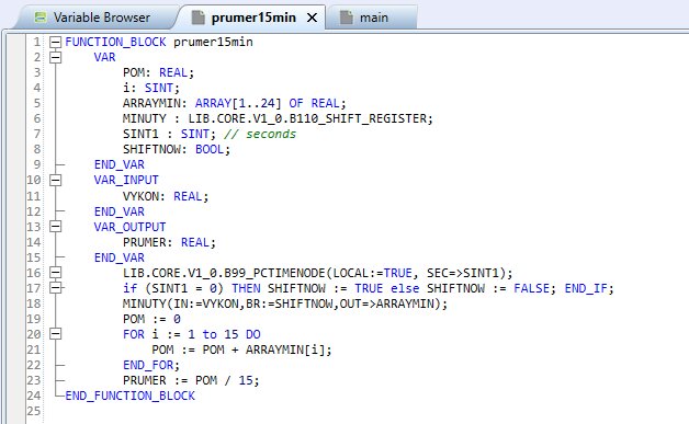 Proměnná MINUTY je typu Analogový posuvný registr (B110_SHIFT_REGISTER), deklarací na řádku 6 se vlastně vkládá a pojmenovává funkční blok tohoto typu. Pokud nastane celá minuta, tedy ukazatel vteřin SINT1 = 0, náběžná hrana proměnné SHIFTNOW posune hodnoty v posuvném registru o jednu dál a na vstup IN vloží aktuální hodnotu výkonu. V posuvném registru jsou tedy vzorky hodnot po minutách za posledních (alespoň) 15 minut (posuvný registr má 24 pozic, ale budeme potřebovat jen prvních 15). V cyklu FOR…END_FOR (viz řádky 20 až 22) se posledních 15 hodnot sečte a v následujícím řádku se vydělením spočítá průměr.