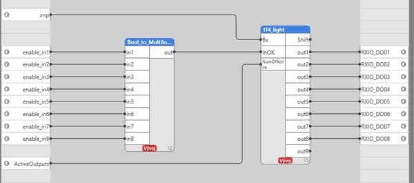 Určitě by šlo se v bloku t14_light obejít i bez pole a deklarovat vstupy „natvrdo“, ale stejně bychom je museli uvnitř vložit do nějakého pole kvůli rotačním operacím a cyklům. Navíc datový typ MultiIoBool umožňuje v bloku použít dynamické výstupy: