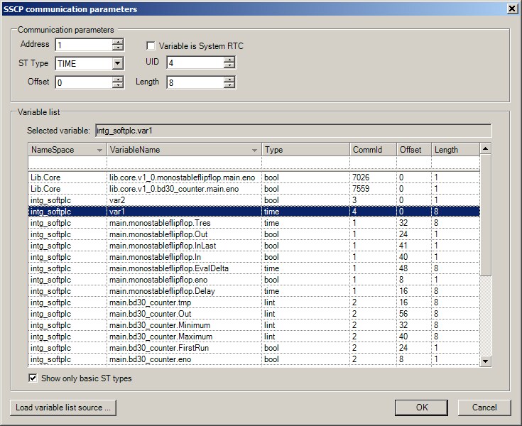Pokud hodnoty vznikají v Domatu a chceme je přenášet do podstanice s runtimem SoftPLC, nejjednodušší je založit v SoftPLC kanál s protokolem SSCP, připojit se jako klient na PLC Domat a hodnoty načítat do SoftPLC proměnných. Jako seznam proměnných v PLC Domat slouží soubor .vlist, který najdeme v projektu Domat po kompilaci v adresáři [název_projektu]\bin\. Soubor je k dispozici ve dvou podobách, s kódováním Unicode a UTF-8.