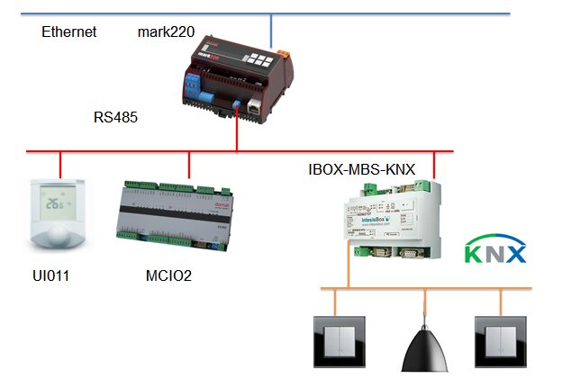 Jedním z rozhraní je převodník IntesisBox IN701KNX3K00000 (nebo starší verze IBOX-MBS-KNX-100), který dokáže integrovat až 100 proměnných ze sběrnice KNX a poskytnout je v podobě Modbusové tabulky. Další verze nabízejí 500 a 3000 datových bodů. Od projektanta KNX potřebuje technik měření a regulace seznam proměnných, které mají být integrovány, s jejich KNX adresami a datovými typy, např.: