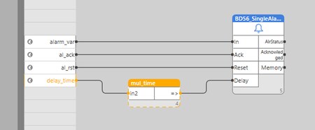 V Merbon IDE HMI verze 2.4.0.x není žádný HMI objekt, který pracuje s časovou proměnnou (typu time). V případě, že potřebujeme v HMI specifikovat čas/dobu (např.: dobu zpoždění alarmu viz obrázek níže - proměnná delay_time), lze využít objekt Analog Setter, který však "pracuje" s číselnými proměnnými jako jsou real, int, ... Toto číslo pak převedeme v programu na časovou hodnotu (formát časové proměnné time) pomocí bloku mul_time.