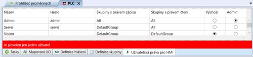 Standardně se po přiřazení PLC do sestavy automaticky předpřipraví uživatelská politika se třemi uživateli: