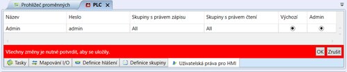 Výsledný stav poté může vypadat například jako na obrázku níže. Pro uložení změn je potřeba potvrdit stisknutím tlačítka OK v červeně zvýrazněné části pod uživateli a poté nahrát sestavu do PLC.