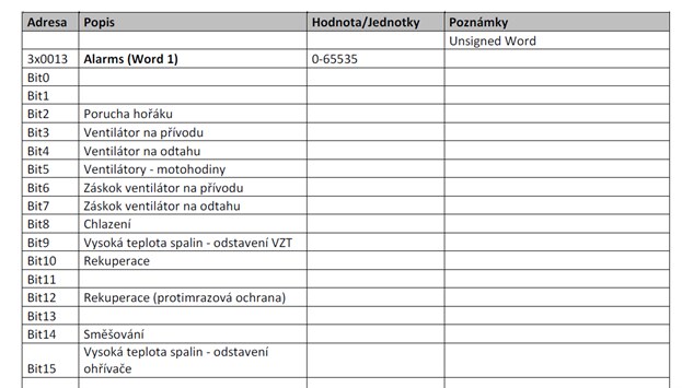 Jako příklad vezměme VZT jednotku Remak s řídicím systémem VCS. V jeho modbusové tabulce zjistíme mj. toto: