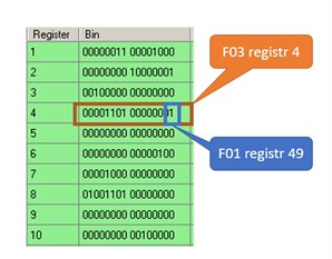 Proč při čtení jednotlivého bitu funkcí F01 se zadává číslo (bitově orientovaného) registru 49? V případě vyčítání stejných dat různými funkcemi se bity číslují od začátku tabulky, takže první (wordový) registr obsahuje (zprava doleva, od nejméně významného bitu) bity 1...16, druhý 17...32, třetí 33...48 a první bit čtvrtého registru je tedy 49.