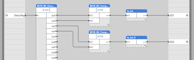 Někdy je ale nejjednodušší vyčíst celý registr jako word a rozebrat ho na jednotlivé bity až v aplikaci. Je to zároveň asi i nejčitelnější pro ty, kteří budou s programem pracovat po nás. Vyčítá se celý registr funkcí F03 nebo F04 do proměnné typu word a tato proměnná se přivede na funkci bitového rozkladu.