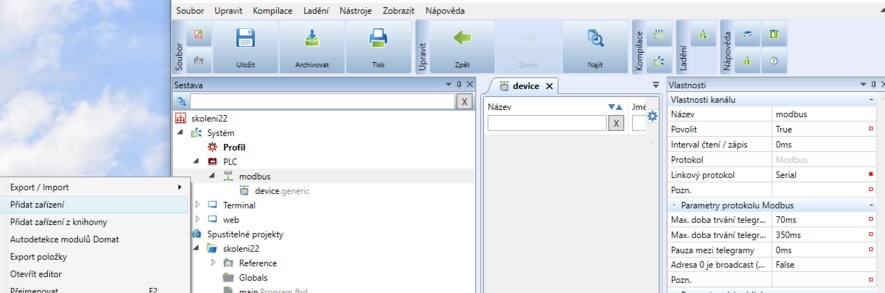 V Domat IDE přidáme k PLC nový kanál, nastavíme správný port a protokol Modbus.