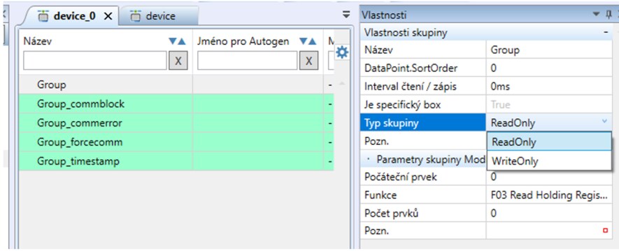 Skupina v podstatě formuluje modbusový dotaz. Jako první zvolíme, jestli skupina bude obsahovat registry pro čtení nebo pro zápis. Tomu odpovídá i funkce, jakou budeme číst či zapisovat. Jaké funkce podporuje vaše modbusové zařízení byste se měli dočíst v jeho modbusové tabulce. Například pokojové ovladače Domat řady UI… podporují funkci F03 (Read Holding Register) pro čtení a F16 (Write Multiple Registers) pro zápis.