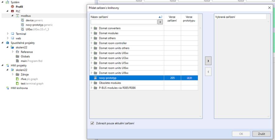 Pokud chceme přidat z knihovny například pokojový ovladač UI010, máme na výběr buď použití konkrétního prototypu UI010, který obsahuje pouze teplotu a vlhkost - nebo můžeme zvolit generický prototyp UI0xx, který je společný pro všechny pokojové ovladače UI a obsahuje většinu registrů, tak jak jsou popsané v modbusové tabulce. Je tam opravdu velká spousta proměnných, takže pokud potřebujeme šetřit místo na PLC, lze nepotřebné proměnné a skupiny smazat, nebo jim vypnout autogen (pak nejsou vytvářeny globální proměnné, je ale možné je kdykoli zapnutím autogenu opět vytvořit).