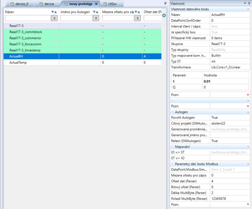 Znamená to, že u skupiny musíme nastavit počáteční prvek 17 a počet prvků 1. Přidáme datový bod a nastavíme mu skupinu, do které patří. Typ proměnné je INT (pokud se nedočtete v modbusové tabulce správný typ, je nutné to zkoušet) a parametr K je 0,01, jelikož jde o hodnotu s rozlišením na dvě desetinná místa. Když budeme chtít vyčíst i aktuální vlhkost, můžeme udělat novou skupinu, nebo registr 19 (kde je ta vlhkost) přidat do té stávající. V tom případě je potřeba jako první upravit počet prvků ve skupině na 3, poté přidat datový bod vlhkost, přiřadit ho do skupiny a nastavit mu offset dat 4 (počáteční prvek je 17 + posun o 4 bajty, tedy 17 LSB, 17 MSB, 18 LSB, 18 MSB) a opět zvolit typ INT a K 0,01.