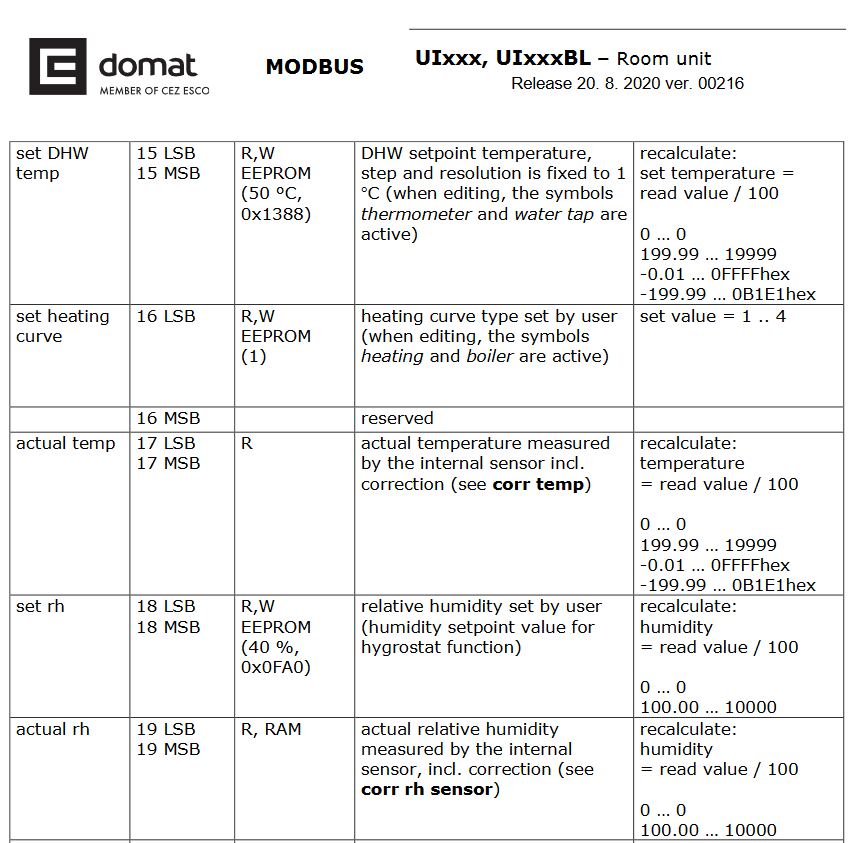 I pokud chceme číst jen jeden registr, ten musí mít svoji skupinu. Například pro vyčtení aktuální teploty z pokojového ovladače Domat UI010 otevřeme jeho modbusovou tabulku a v ní se dočteme, že teplota je v registru 17.