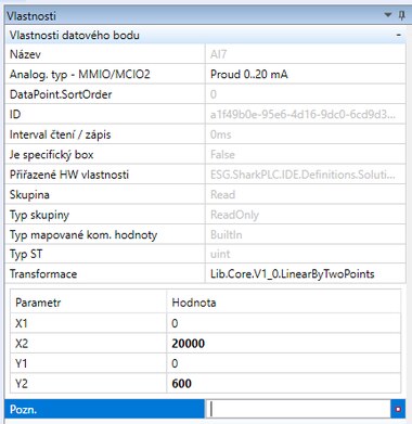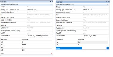 Obě transformace poskytují stejné výsledky, koeficient K = 60 = 0,001 * 600 (přepočet mV na kPa) je ale na první pohled méně srozumitelný než dvoubodová transformace (X1...Y2) vlevo.