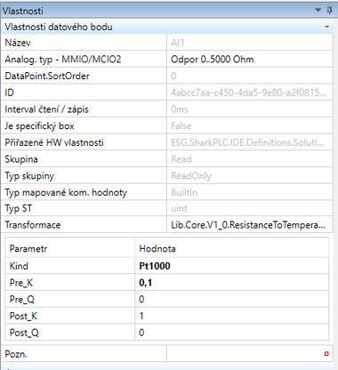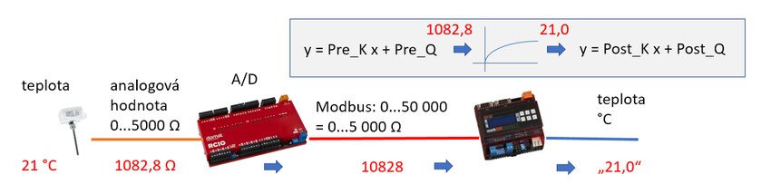 Transformace Pre... se používá jednak pro přepočet Modbusové hodnoty na odpor, jednak ji lze využít pro kompenzaci odporu vedení mezi čidlem a I/O modulem. Transformace Post... se používá pro kompenzaci chyby měření samotného čidla a zadává se v K.