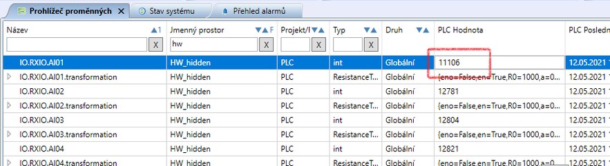 Pro AI01 je to zde 1110,6 Ω, což je korektní měřená hodnota (odpovídá teplotě 28,4 °C). Podle této hodnoty poznáme, zda problém je v nastavení I/O modulu, nebo v kódu v PLC.