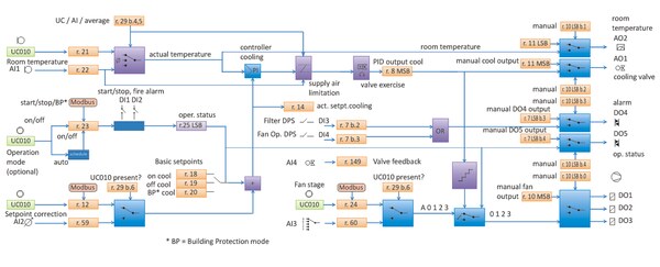 Regulátor dále obsahuje dvě rozhraní RS485 s protokolem Modbus RTU: jedno pro připojení pokojového ovladače UC010 a případně dalších slave regulátorů, druhé pro integraci do nadřazeného systému (řídicího systému budovy, BMS). Komunikativní pokojový ovladač UC010 může být nahrazen nebo doplněn analogovým pasivním čidlem teploty a volitelně i potenciometrem pro nastavení teplotní korekce. To se používá v případech, kde uživatel nemá mít možnost zasahovat do systému (veřejné prostory, školy, nemocnice) nebo zákzník vyžaduje zvláštní ovladač v designu stejném, jako mají použité elektroinstalační prvky.