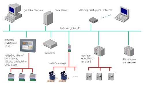 Do centrálního řídicího systému jsou integrována prakticky všechna důležitá technická zařízení budovy. Kromě systému větrání, vytápění a klimatizace jsou to především data z centrály EZS a EPS – stavy protipožárních klapek se zobrazují v půdorysech, dále hodnoty a alarmy z klimatizačních jednotek serveroven a hodnoty z regulátorů jednotlivých kanceláří. Pro hospodárný provoz budovy jsou důležité údaje z měřičů energií – elektřiny, tepla, chladu a vody, kterých je v budově více než stovka. Některé centrální odečty jsou dodavatelům médií hlášeny automaticky e-mailem.