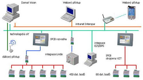 Řízené okruhy: klimatizace prodejní haly, zázemí i dalších obchodů a prostor, vytápění, osvětlení venkovní i vnitřní, chladicí jednotky, sběr hodnot z chladicích pultů Linde.