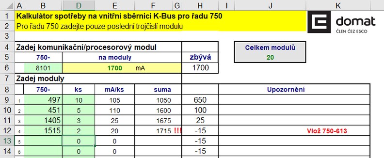 Zatížení modulu snadno spočítáme pomocí kalkulátoru zátěže, dostupného na stránkách domat.cz v sekci Ke stažení – Technická dokumentace - Pro projektanty. Do sloupce B zadáme poslední troj- nebo čtyřčíslí komunikační karty a do sloupce D počet kusů na sběrnici. Ve sloupci H se zobrazí zbývající proud pro následující karty. Pokud je výsledek záporný, musíme ubrat karty a vložit napájecí modul 750-613.