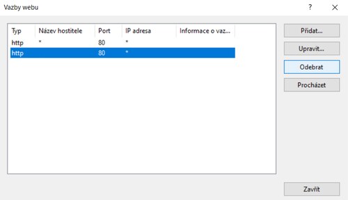 Problém lze vyřešit kliknutím pravého tlačítka myši na web, kde vybereme možnost “Upravit vazby”. V dialogovém okně bude zdvojený port 80 nebo případně 443 pokud používáme SSL šifrování. Označíme druhou definici portu (pravděpodobně nebude mít název hostitele) a dáme “Odebrat”. Ponechme tedy jednu vazbu viz: