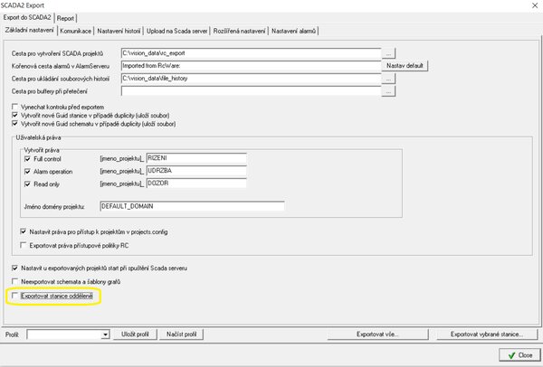 V dřívějších dobách nižších výkonů PC se v případě extrémně velkých projektů doporučovalo exportovat stanice (projekty) odděleně. Při odděleném exportu, což šetří výkon PC, se mohou ztratit vzájemné vazby mezi projekty (prokliky z jednoho projektu do druhého apod.). V dnešní době by této možnosti nemělo být potřeba a měli bychom vždy exportovat stanice pohromadě (neodděleně). Proto při exportu RcWare projektu do SCADA nezaškrtávejte vlastnost Exportovat stanice odděleně, viz obrázek níže.