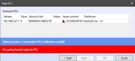 Pokud se při detekci PLC zobrazuje červený trojúhelník a na PLC následně nelze nahrát sestavu – Chybová hláška „Cílové zařízení obsahuje starý runtime, update je nutný“