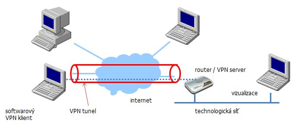 Obr.2: Připojení do technologické sítě pomocí VPN. Softwarový VPN klient na vzdáleném počítači naváže spojení s VPN serverem a sestaví zabezpečený tunel. Vzdálený počítač je pak součástí technologické sítě.