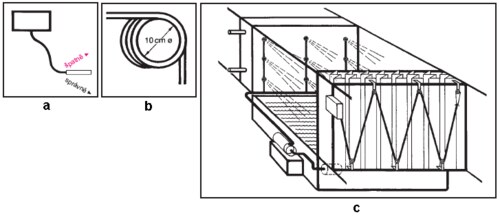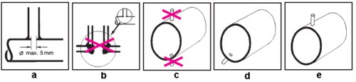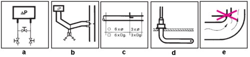 Pro hadičky do délky jednoho metru stačí jejich vnitřní průměr 4 mm. Při větších vzdálenostech mezi odběrným místem a čidlem tlaku použijte hadičku o větším průměru, např. pro 7 m průměr 15 mm, pro 10 m průměr 20 mm. Místo pro odběr tlaku nesmí být ovlivněno nepravidelnostmi potrubí (obr. 5e).
