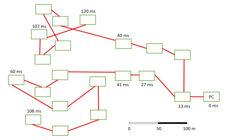 Topologie sítě, časy u některých uzlů jsou odezvy příkazu ping vůči PC