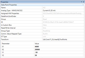 U lineární transformace „Kx + Q“ například pro čidlo tlaku 0...20 mA s rozsahem 0...6 bar bude K = 6 / 20000 = 0.0003 a Q = 0, pro čidlo vlhkosti 4...20 mA s rozsahem 0...100 % získáme koeficienty vyřešením soustavy dvou rovnic pro 4 a pro 20 mA: