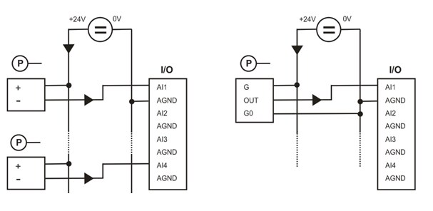 Pro dvouvodičové čidlo musí mít modul i zdroj společnou zem, aby zdroj mohlo využívat více čidel zároveň. To je realizováno v bodě propojení AGND (případně AIC, podle typu modulu) a 0 V.