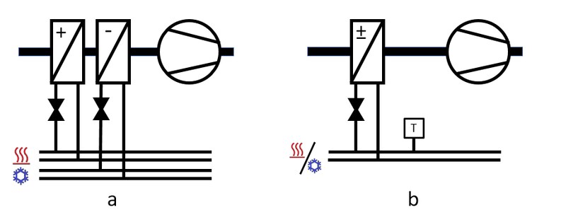 U dvoutrubkového zapojení (obr. 1 b) je ale v jediném potrubí buď topná, nebo chladicí voda. Režim topení, nebo chlazení se tedy musí určit centrálně pro celou budovu a podle toho se aktivuje zdroj tepla, nebo chladu.
