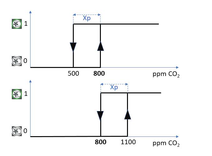 In the control system settings, the room CO2 setpoints and hystereses in the on-off controllers should be revised. It is also advisable to verify that the controller setting corresponds with the required functionality: There is CO2 setpoint of 800 ppm at both images below. However, the first one switches on when the setpoint is reached („the critical pollution level was achieved“), while the other switches off at the same setpoint („the air is now clean enough“). The hysteresis (Xp = 300 ppm) is set up so that the unit does not start too frequently.