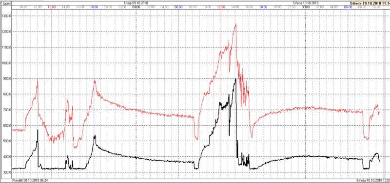 Because of mechanical stress (especially at transport and installation), temperature changes, and ageing of components, the output signal may change in time and the sensor accuracy decreases, i.e. the sensor is „drifting“. This is why regular calibration is necessary. The following image shows two non-calibrated sensors of different manufactures (with different measuring elements) installed in the same room. In a year’s time the absolute difference of measured values rose from 80 to about 300 ppm, as seen in the plot. The black curve drifts down on a long-term basis, the red curve drifts up (which is not visible at this image as it only shows a short part at the end of the testing period). The lowest measured values of both curves should approach the 400 pm line from above.
