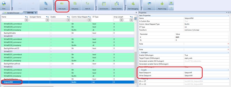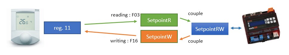 Therefore it is useful to create a variable which allows both to update its value from the room unit, and to write its value into the room unit on change. This can be achieved by a so called couple, or connection of two hardware I/O data points. A couple also represents a global variable.