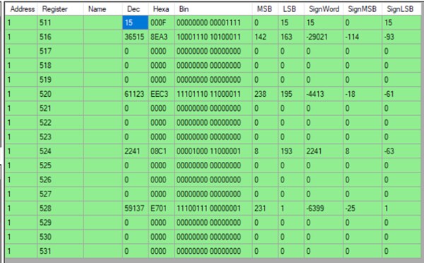 If we were to use the ModComTool service program as a Modbus client for tests, the completed Modbus table looks like this: