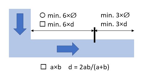 It is preferable to install the probe in the pipe rather than directly in the unit. In the duct, the air flow is smoother and the vibration of the unit is not transmitted to the sampling tubes or the sensor itself. The recommended distance from elbows or other disturbing elements, the so-called calming length, is six times the diameter of the pipe. For pipes with a rectangular cross-section, the so-called equivalent diameter d applies.