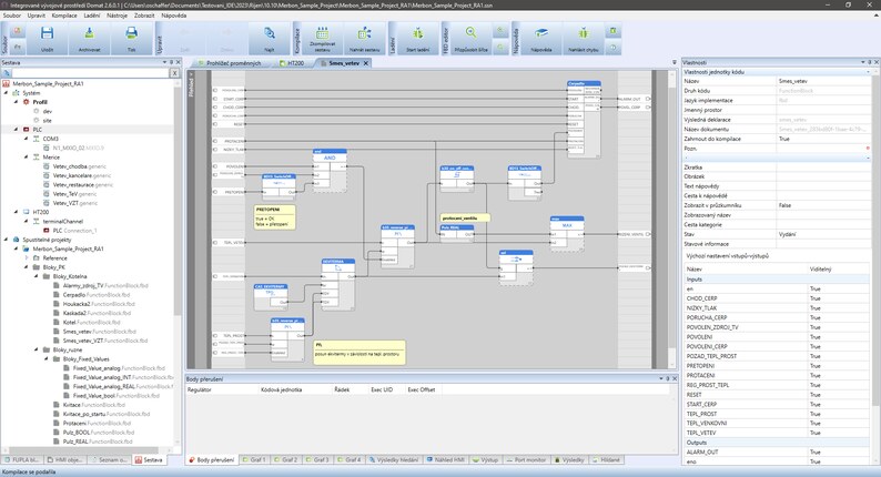 For comfortable commissioning, Domat IDE contains an intuitive debugger with program tracing, step-by-step debugging, and stepping into procedures and composed function blocks. It is also possible to trend the variables and monitor the serial communication (port monitor), even over the Internet. Domat IDE thus helps saving service and commissioning costs.