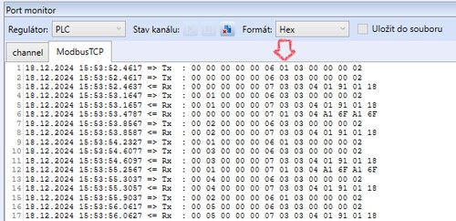 Although with Modbus TCP it is theoretically possible to open multiple queries (transactions) at the same time and wait for the replies to start coming back, in a PLC the driver is implemented in such a way that in one TCP stream (i.e. in communication to one IP address) the next query is sent only after the reply to the previous query returns. In the following example there is communication with two servers at different IP addresses. Although the IP addresses are not visible in the listing because the port monitor only shows the Modbus application layer and not the whole IP communication (which would be visible e.g. in Wireshark), we can distinguish the servers by different Modbus link addresses: 01 and 03. The column with the link address is marked with a red arrow.