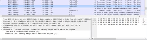 When communicating with a Modbus TCP / RTU router, it must be taken into account that the serial link does not have nearly the same throughput as Modbus TCP in an Ethernet network. Besides the fact that we must not exceed the maximum number of simultaneously connected clients (which is a feature of the "network side" of the router), it is often necessary to extend the timeout and especially the gaps between telegrams in the case of multiple client connections. This is especially true if we are querying dozens of registers at the same time (it optimizes the bus traffic, but the replies are longer, the packets cannot be "chopped" as much and this increases the risk that there is no time to handle the query before the timeout expires). For example, where 200 ms is sufficient for a single client, when another client connects, the original communication may start to drop out. In Wireshark, the error would look like this: