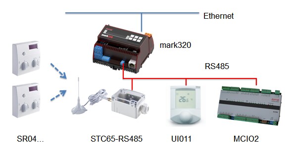 Peripherials which can be used for integrated room controls are room units (eg. SR04P containing a temperature sensor and setpoint correction) and solar-powered magnetic window contact SRW01. One converter can host up to 32 EnOcean devices. To commission the system, only a RS485 converter and Thermokon configuration program (free for download) are necessary. The configuration software is used to attach the sensors to the STC65-RS485 converter.