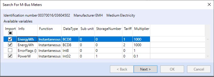 In the M-Bus channel context menu there is a function Search M-Bus meters on network.