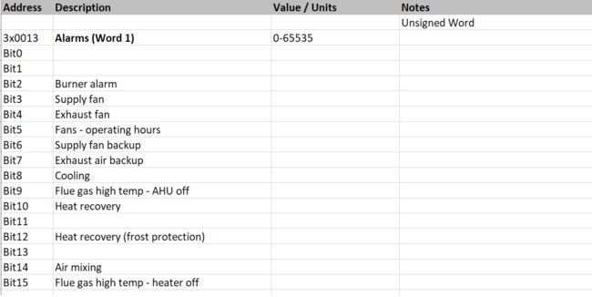 As an example, let's take the Remak HVAC unit with the VCS control system. In its modbus table we find, among other things, the following: