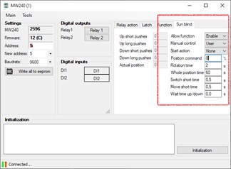 - in order to use the MW240B module for blind control purposes, this function must be enabled by setting bit 7 in reg 5 MSB (Allow function),