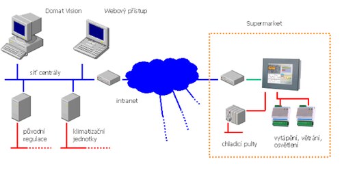 The building management system control not only the central plant in Modletice, but also the branch stores which are connected by intranet. The virtual technological network links the BMS with touch screen process stations and interfaces for data acquisition from commercial refrigeration.