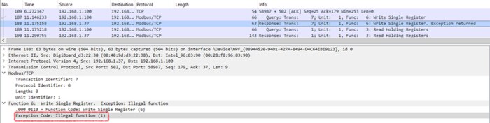 The Modbus server reports an error – Illegal function when the client tries to write data. According to the documentation, the server supports only F16 (Write Multiple Registers) for writing, but here the client tried to write using the F06 (Write Single Register) function.