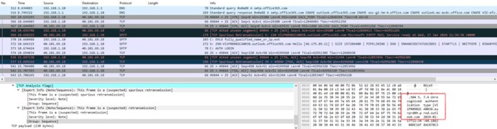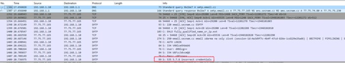 The PLC as a client establishes a connection to the e-mail server. In packet 372 (the number is in the first column from the left) the server offers possible ways of secure communication (... STARTTLS...), but the PLC tries to log in directly (packet 373, AUTH LOGIN). This attempt is rejected by the server and the connection is terminated, in packet 542 we see the explanation: unrecognized authentication type.