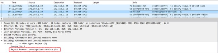 In the following packet, the server (address 192.168.1.10) responds to the request to send the value when changes are made (Subscribe COV) that this service is not known (unrecognized service). The client must therefore periodically query the value itself using the Read Property function - in this example it starts doing this automatically, as we see in the following packet No. 11.