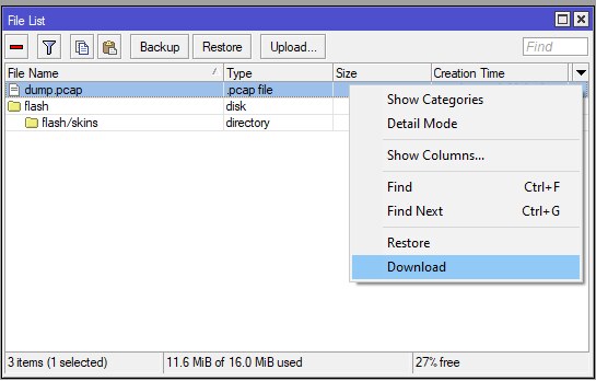 In the tmp directory there is then the file out.pcap, which can be downloaded using WinSCP and opened normally on the PC with the Wireshark program. After downloading it is advisable to delete the file from the PLC.